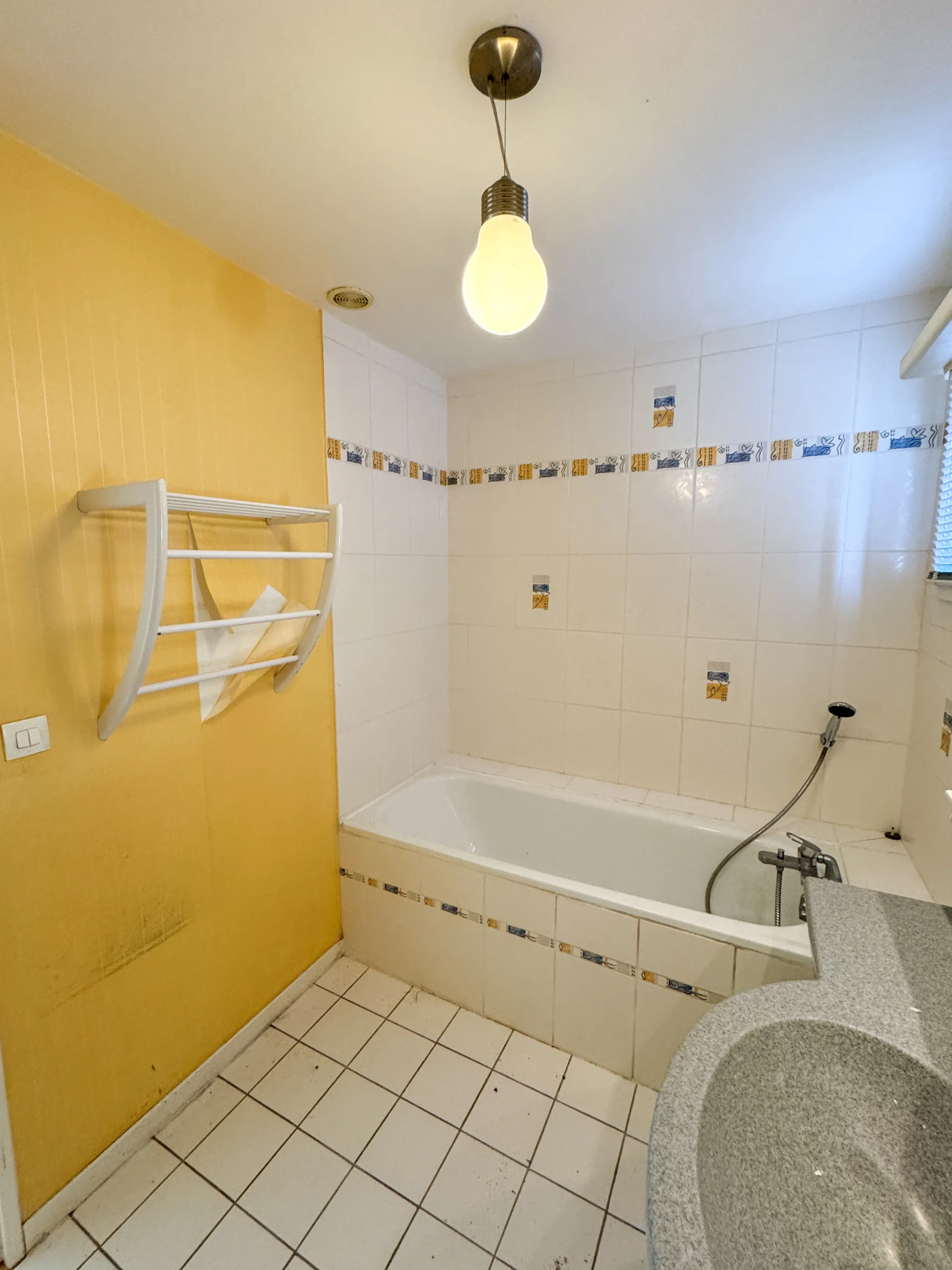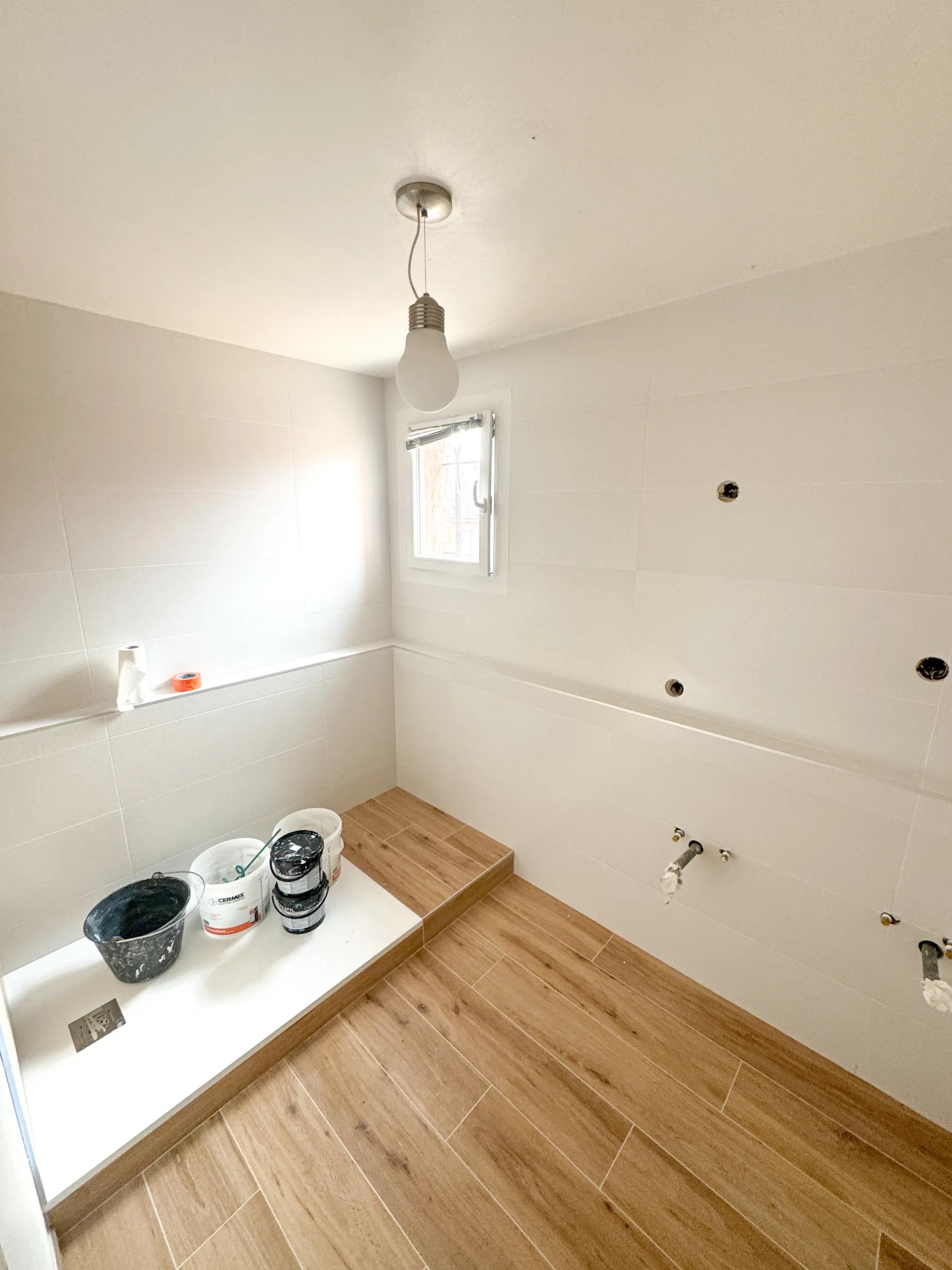 Avant la pose du carrelage beige clair, les murs et les sols sont soigneusement préparés : ponçage, dégrossissage, application d’un primaire d’accrochage sur les surfaces destinées à être carrelées, rattrapage de niveau avec un doublage de plaque spécifique et ratissage des zones non carrelées. Deux couches de peinture de finition viennent homogénéiser l’ensemble des parties murales visibles.