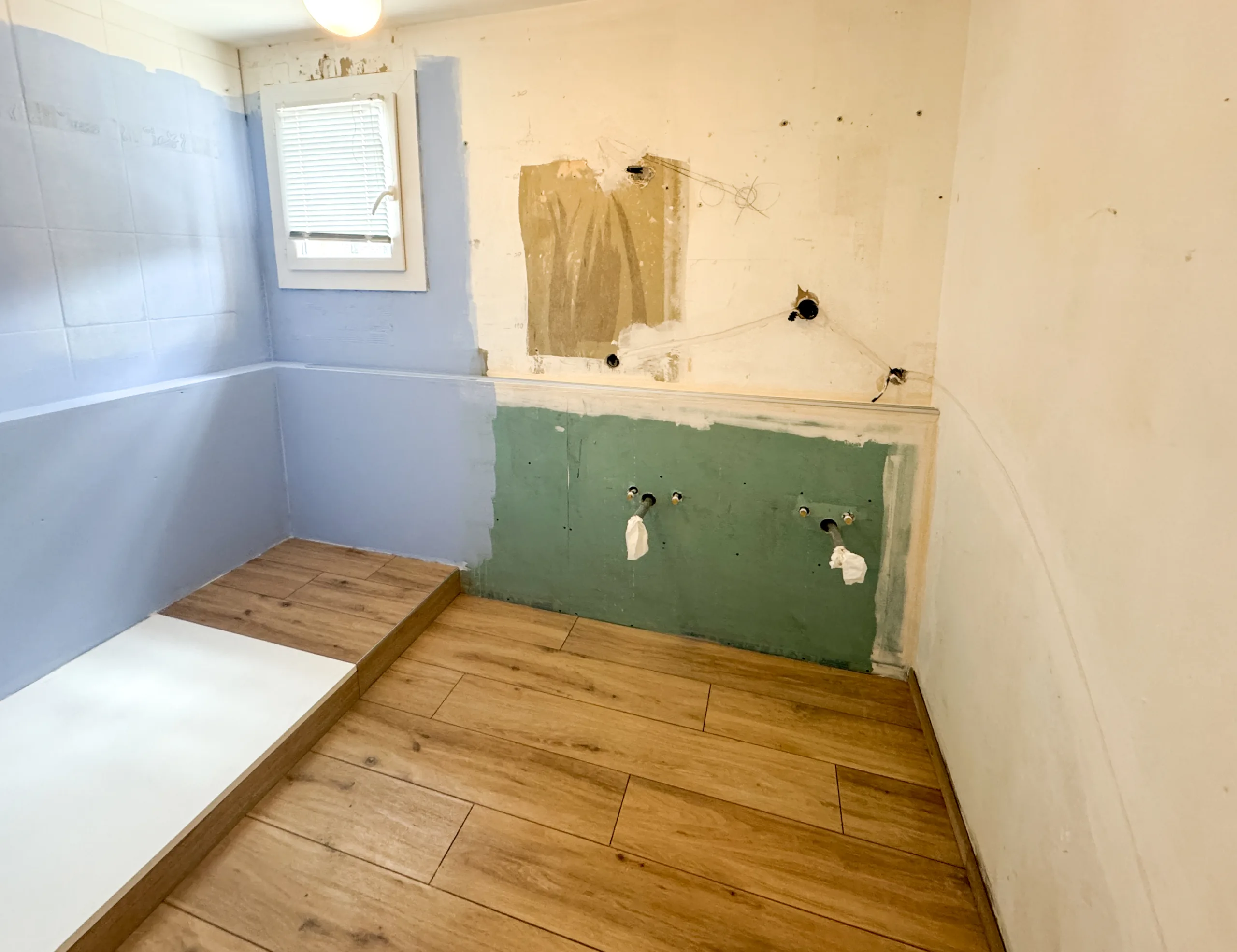 • l’intégration de la tuyauterie dans les murs ou, lorsque ce n’est pas possible, la création d’un doublage adapté pour cacher les réseaux et préparer les surfaces au carrelage.