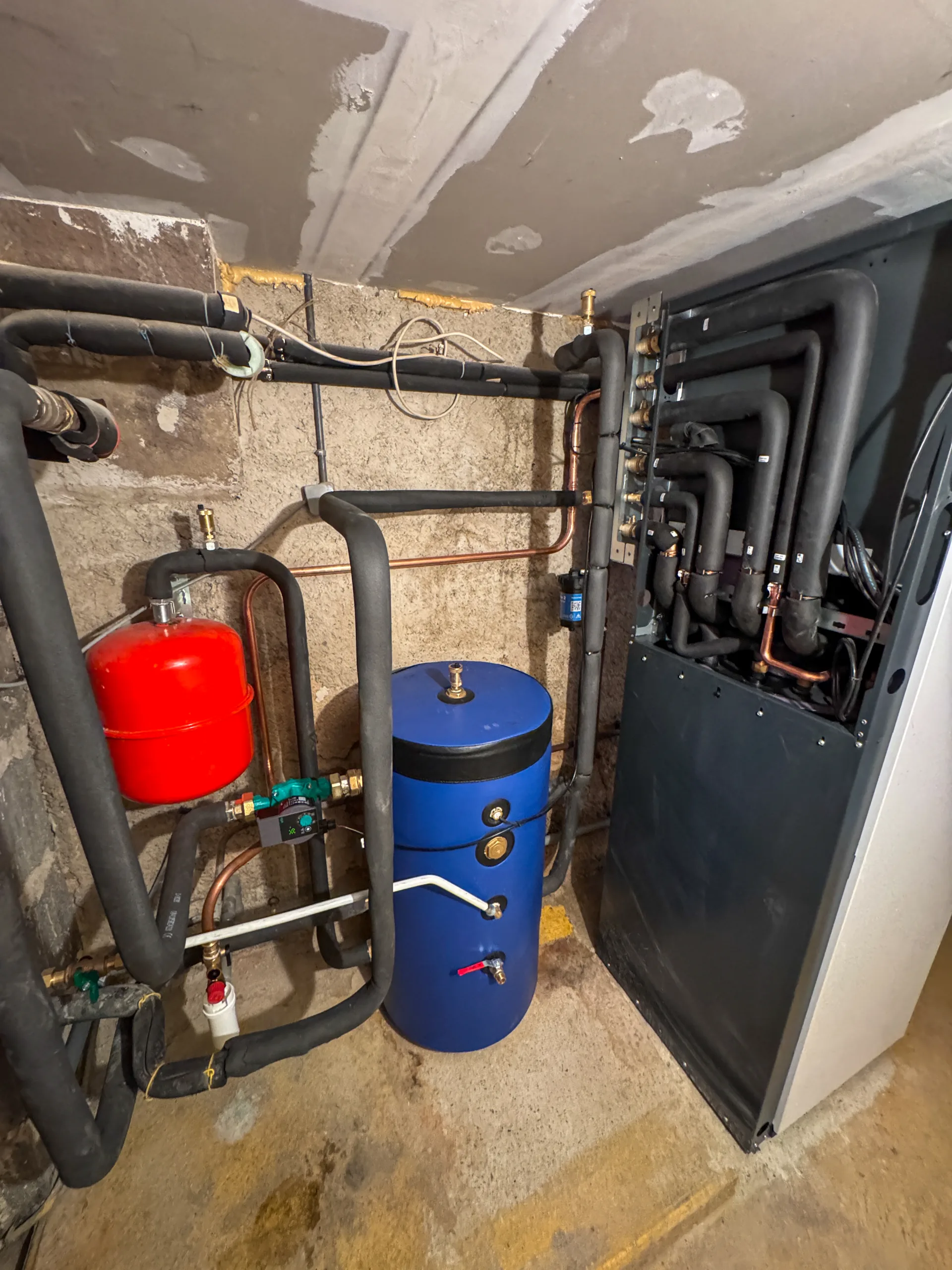 La mise en place de la PAC monobloc a nécessité une organisation rigoureuse du local technique. Nous avons installé l’unité intérieure ainsi qu’une bouteille de mélange de 100 litres murale pour garantir une parfaite inertie au réseau. Le raccordement hydraulique inclut des composants de sécurité haut de gamme : pot à boue, séparateur d’air SpiroVent RV2, et un disconnecteur de remplissage antipollution pour protéger le réseau d’eau potable.