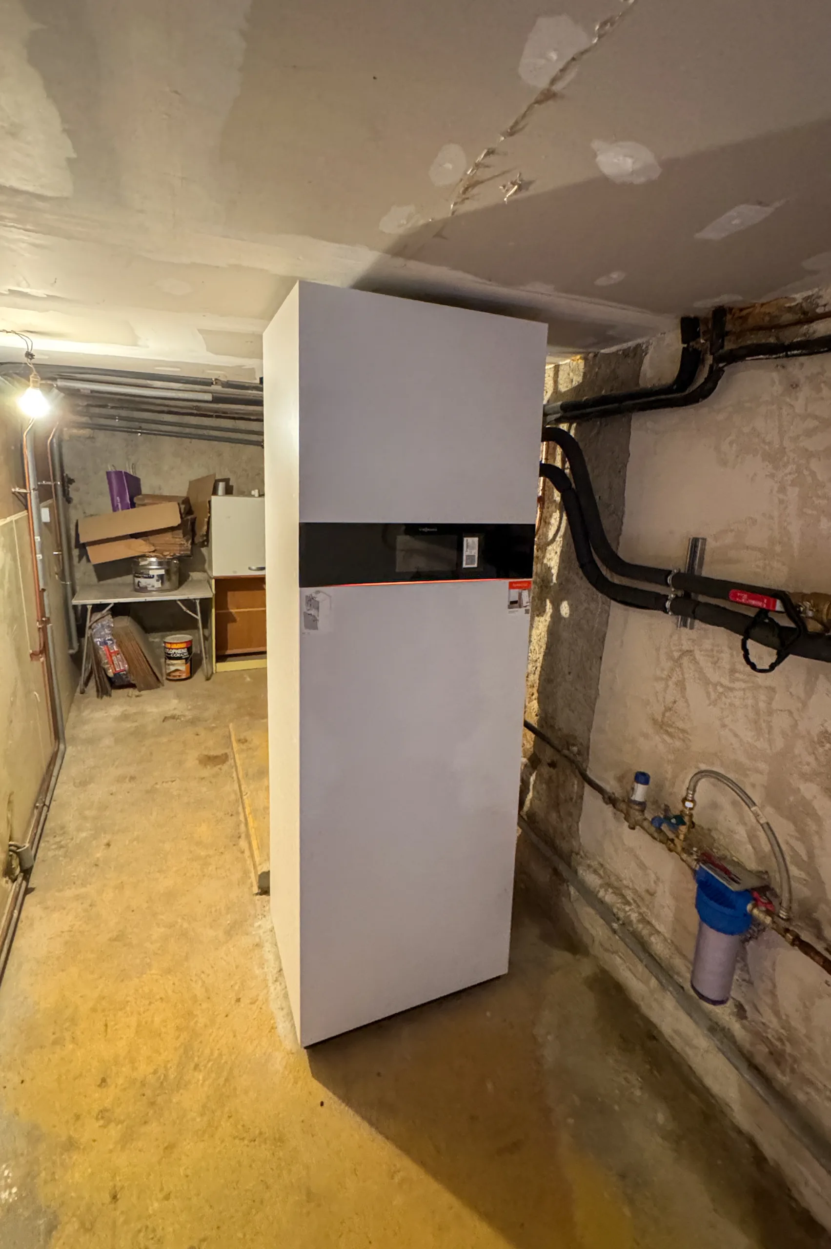 Une fois l’espace libéré, nous avons procédé au nettoyage complet du réseau. Un désembouage chimique et mécaniqueà haute pression a été réalisé à l’aide des produits Sentinel X800 et X100. Cette phase est cruciale pour l’installation d’une pompe à chaleur Viessmann Vitocal haute température, car elle assure la longévité de l’échangeur thermique et maintient un rendement optimal sur les radiateurs existants en éliminant les boues accumulées au fil des décennies.