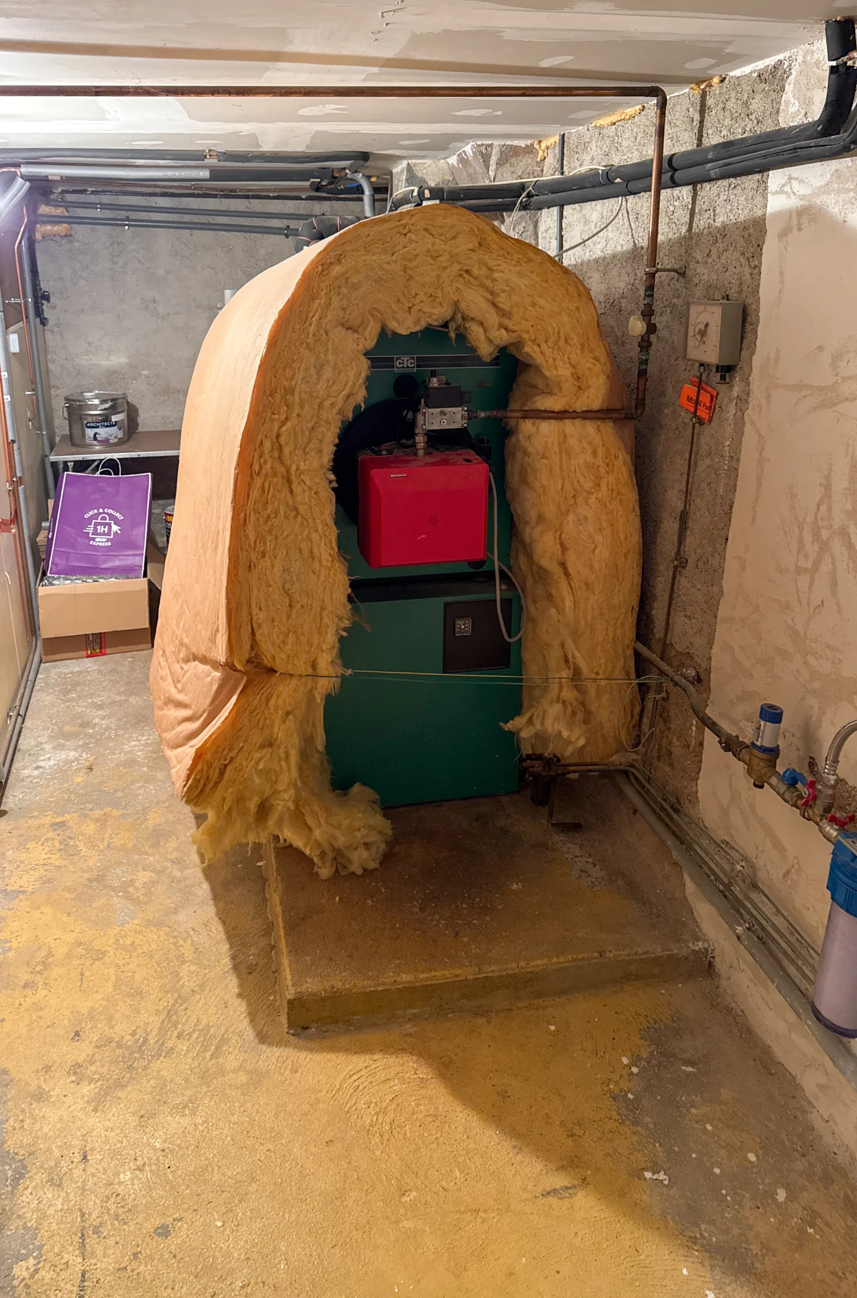 Notre intervention a débuté par une analyse thermique précise des besoins de la famille Doury. La problématique était claire : substituer une chaudière gaz non condensation par un système écologique capable de chauffer un volume important. La première étape a consisté en la vidange et la dépose de la chaudière gaz de marque CTC, un équipement massif qui occupait une place considérable au sous-sol.