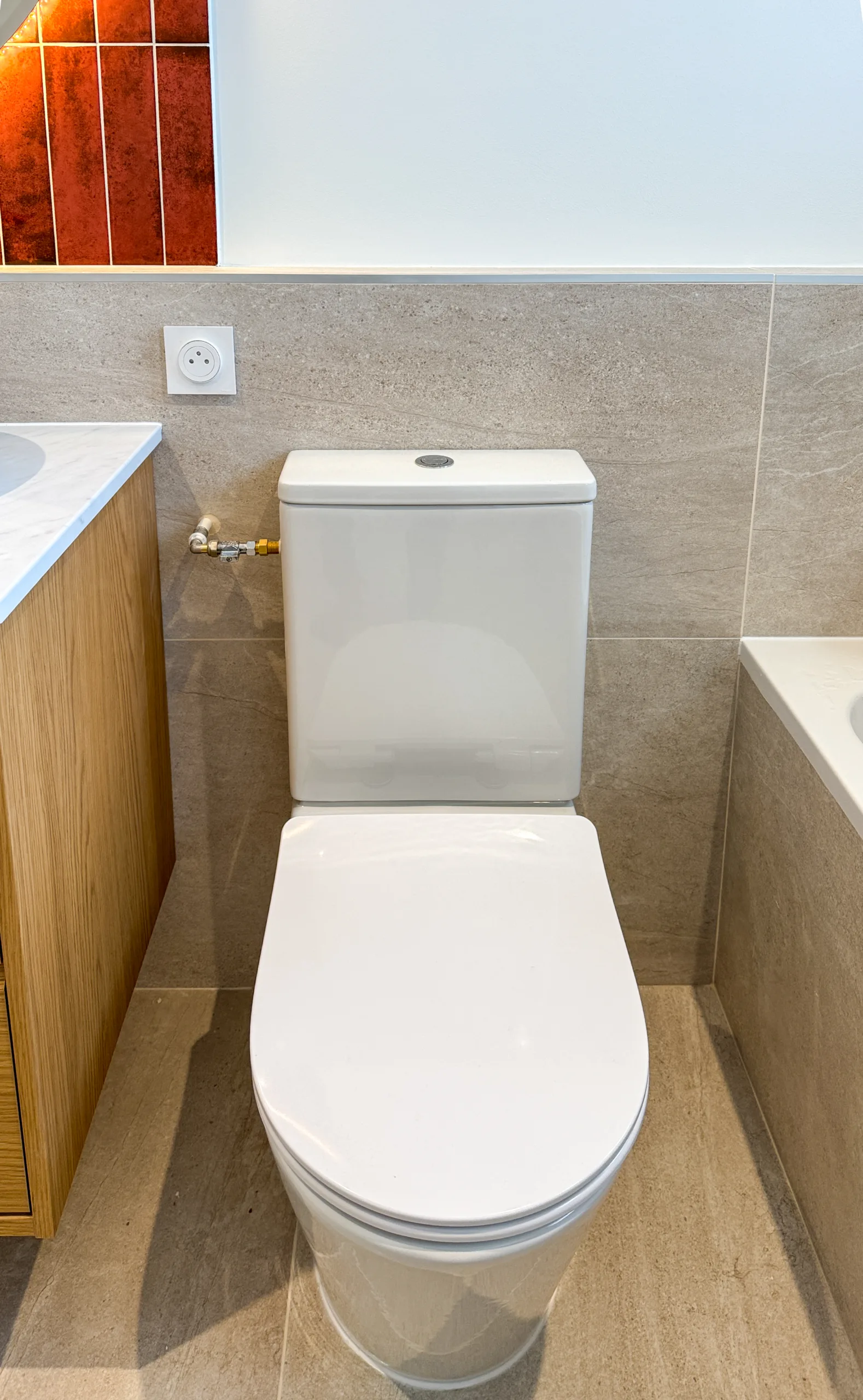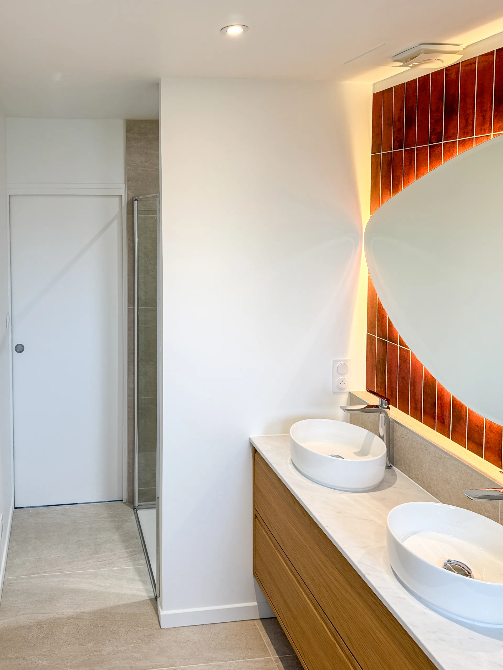 L’élément central de cet agencement est la zone vasque. Nous avons opté pour une pose verticale de faïence couleur Rouille/Terracotta sur toute la hauteur. Ce choix architectural étire les volumes et réchauffe instantanément l’atmosphère. Pour sublimer cette texture, un miroir organique rétro-éclairé (forme galet) a été installé, diffusant une lumière douce et sophistiquée sur la céramique. Le mobilier suit cette ligne naturelle avec un meuble double vasque en bois clair, surmonté d’un plan blanc épuré et de deux vasques rondes à poser.